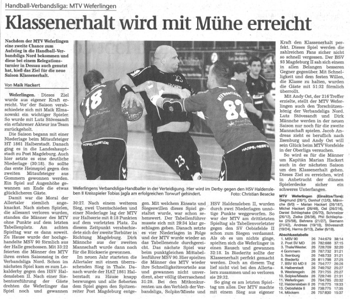 HSV Vechelde-Woltorf - MTV Weferlingen 30:24 (13:14). „Das war ein wichtiger Sieg auf dem Weg zum Klassenerhalt“, freute sich HSV-Trainer Torsten Deda. Der Neuling startete erwartungsgemäß nervös und machte einfache Fehler in Angriff und Abwehr. Weferlingen hatte zunächst leichtes Spiel bis auf 11:5 davonzuziehen. Ab der 15. Minute stabilisierte sich aber die Abwehr und auch der Angriff wurde zunehmend sicherer. Die HSV reduzierte den Rückstand bis zur Pause auf ein Tor.